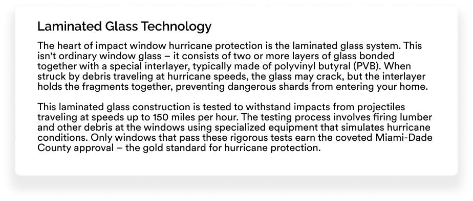 Flying debris is one of the most dangerous aspects of hurricane conditions. Traditional windows offer virtually no protection against projectiles like roof tiles, tree branches, or construction materials that become missiles in hurricane-force winds. Impact windows are specifically designed to withstand these impacts without compromising your home's protective envelope.