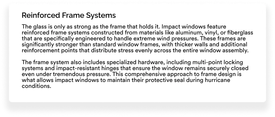 Impact windows are engineered specifically to withstand the extreme conditions that hurricanes bring to Central Florida. The secret lies in their multi-layered construction, which combines impact-resistant laminated glass with reinforced frames and heavy-duty hardware designed to handle tremendous wind loads and flying debris.